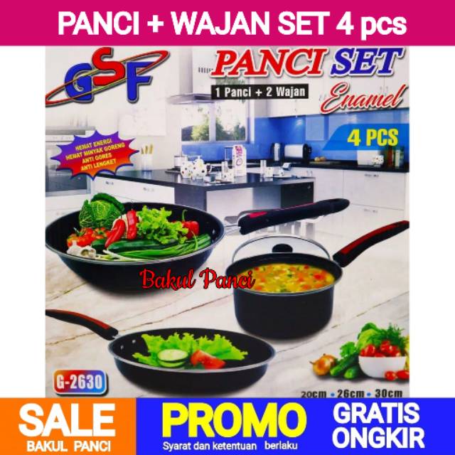 Deskripsi Panci Wajan Penggorengan Set GSF 4 PCS G-2630 / G 2630 / G2630Barang baruSatu Set peralatan masak serba guna.Kualitas bahan terbuat dari enamel yang dapat menghantar panas dengan cepat dan merata serta anti karat.Dilengkapi dengan tutup kaca yang anti panas memudahkan anda untuk melihat masakan dan tingkat kematangan pada masakan yang sedang anda masak.Memasak tanpa menggunakan banyak minyak dan mudah dibersihkan.Kelebihan produk :- Dilapisi dengan lapisan anti lengket.- Lapisan tidak mudah terkelupas dan berkarat- Bahan tebal, kuat dan tahan lama.- Handle tidak panas, nyaman ditangan- ukuran panci :I. panci susu : D.18,5cm T. 10cmIII. pan besar : D. 30cm. T 7,5cmIV. pan sedang : D.26cm. T.5cmNOTE :- TIDAK BERGARANSI.- KAMI MENGIRIM BARANG DALAM KONDISI BAGUS, JIKA TERJADI KERUSAKAN PADA SAAT PENGIRIMAN ITU DILUAR TANGGUNG JAWAB KAMI.- PECAH / PENYOK TIDAK DITANGGUNG DAN TIDAK DAPAT DIKEMBALIKAN.- KAMI TIDAK MENERIMA RETUR ATAU KOMPLAIN DALAM BENTUK APAPUN.- JIKA WARNA YANG DIPILIH KOSONG, KAMI AKAN MENGIRIMKAN WARNA SESUAI DENGAN PERSEDIAAN YANG ADA SAAT ITU.- ATC / ORDER BERARTI = SETUJU..!!!Terimakasih,BAKUL PANCI#wajanteflon #wajan #wajanGSF #wajanenamel #wok #wajanantilengket #wajanset #wajanpenggorengan #saucepan #wajangsfset #wajanserbaguna #wajantelur #wajanenamelmurah #wajanserbaguna #frypan #panci #pancikuah #pancisup #gsf #penggorenganantilengket #antilengket #panciserbaguna #saucepan #panci