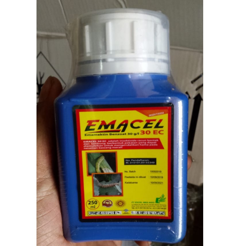EMACEL 30 EC (umum) :250mlemamektin benzoat (emamectin benzoate) : 30 g/lInsektisida racun kontak dan lambung berbentuk pekatan yang dapat diemulsikanBawang merah : penggorok daun Liriomyza huidobrensis (Penyemprotan volume tinggi : 1,5