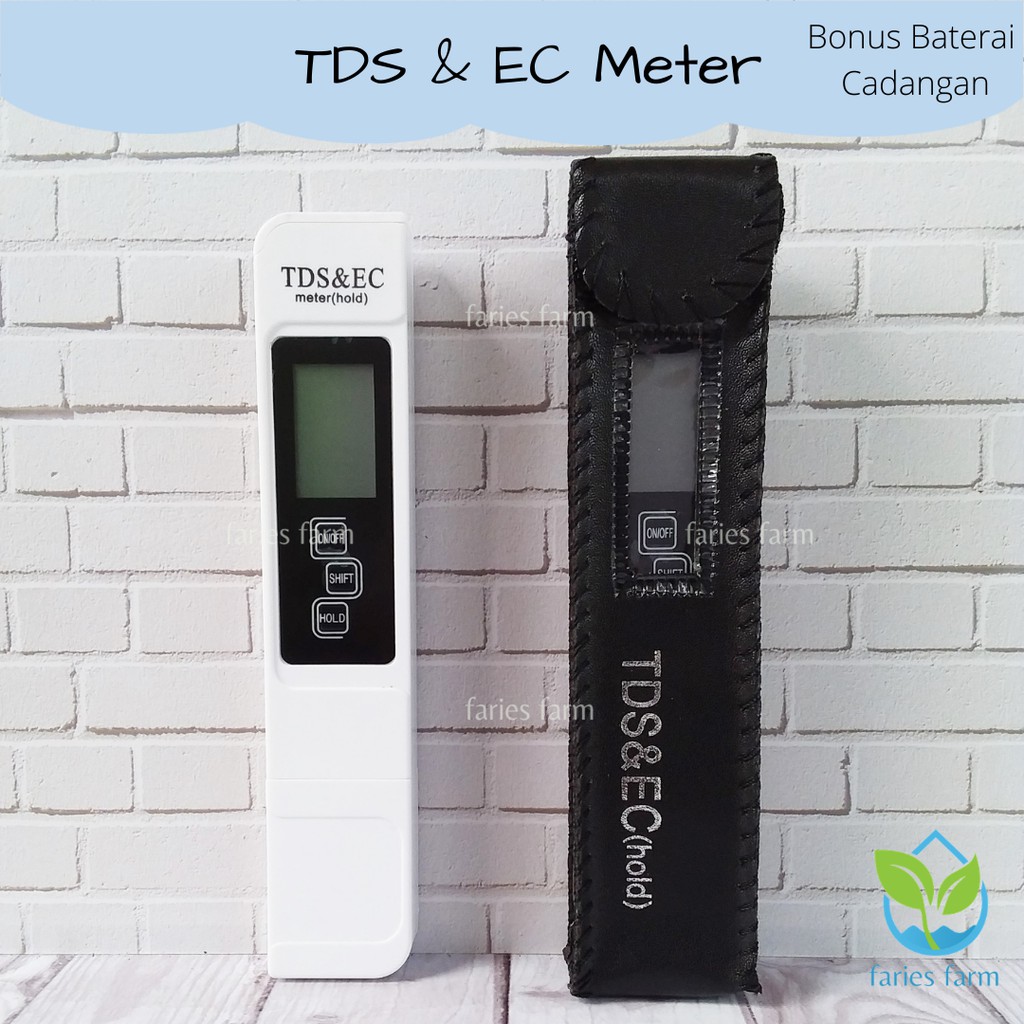 TDS & EC METER (Alat Ukur Hidroponik)Bonus Baterai CadanganTotal Dissolved Solids (TDS) meter digunakan untuk mengukur berat total semua padatan (mineral, garam atau logam) yang dilarutkan dalam sejumlah volume air, dinyatakan dalam miligram per liter (mg/L) atau part per million (PPM).Electrical Conductivity (EC) meter digunakan untuk mengukur konduktivitas listrik dalam larutan, dinyatakan dalam micro siemens per centimeter (uS/cm).Isi Paket:- 1 buah TDS/EC Meter- 1 lembar Kertas Panduan- 1 buah Sarung Kulit- 1 buah Baterai Kancing CR 2032 ( terpasang)- 1 buah Baterai Kancing CR 2032 ( cadangan)Fitur:- Pengukuran Ganda: TDS (PPM) dan EC (uS/cm).- Fungsi Temperatur: Mengukur suhu/temperatur larutan.- Fungsi Hold: Menyimpan pengukuran untuk kenyamanan pembacaan.- Fungsi Auto-off: Otomatis mematikan meter setelah 10 menit tidak digunakan untuk menghemat baterai.Spesifikasi:- TDS: 0-5000 PPM- EC: 0-9990 uS/cm- Temperatur: 0.1 - 80.0 C / 32.0 - 176.0 F- Akurasi: +/- 2 %- Baterai: 1 x 3V Lithium Cell Battery (Baterai Kancing)- Ukuran: 154 x 30 x 14 mm- Berat: 55 grInstruksi Penggunaan:1. Lepaskan tutup pelindung2. Hidupkan TDS/EC meter3. Rendam TDS/EC meter ke dalam air/larutan sampai ke batas maksimum (+/- 2 inci)4. Tunggu sampai angka pada layar stabil. TDS/EC meter akan otomatis mengkompensasi variasi suhu. Setelah pembacaan stabil (30 sampai 45 detik), tekan tombol hold untuk menghentikan pengukuran sehingga angka tetap terbaca setelah TDS/EC meter diangkat.5. Tekan tombol SHIFT untuk berpindah antara pengukuran TDS/EC dan C/F.5. Setelah penggunaan, keringkan TDS/EC meter dari sisa la