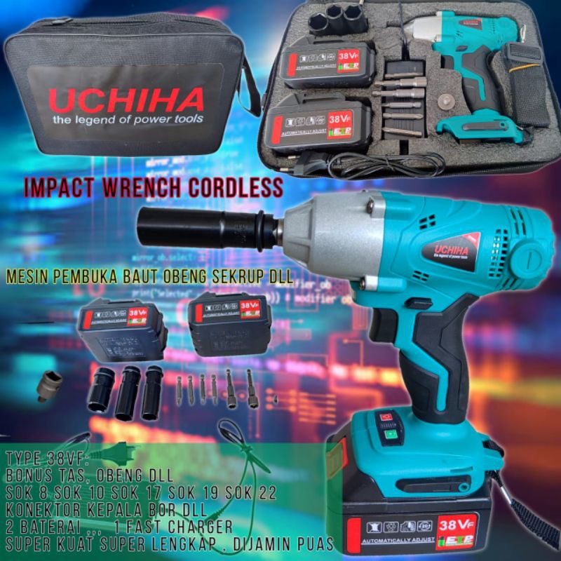 Impact Wrench Bor Cordless type 38Vf uchiha japanBiasa digunakan untuk membuka dan mengencangkan baut pada sebuah konstruksi atau komponen kendaraan bermotor.Selain itu bisa juga di gunakan pada pekerjaan konstruksi baja dan kayu.Spesifikasi Impact Wrench Bor Cordless BRUSHLESS UCHIHA:* Voltage : 38Vf* Speed : 0-3800 r/min* Torque (Max) : 350 N.m (terkuat dikelasnya)* Battery Type : lithium ion* Charger input : 220V* Temperature range : 5-40C* Rechargeable Battery : 38Vf (12.0Ah) * Terdapat Charger Dan 2 Battery.* Garansi Resmi UCHIHA* Service center tersebar di kota besar Indonesia.* Ukuran mata sock impact square 1/2" .* Mesin ini punya kelebihan tidak memakai jenis arang (BRUSHLESS) dalam operasionalnya .Impact Wrench ini jg memiliki indikator baterai lampu 3 garis warna yang dapat kita ketahui, apakah Impact masih Strong, Normal atau Low.Saat Lock di posisikan ketengah, maka otomatis semua indikator mati.Juga ada lampu LED untuk penerangan saat bekerja. Fast charging super dengan 2baterai.Jadi saat satunya dipakai . Maka baterai kedua di ces berbarengan. Dengan begitu saat baterai yg dipakai belum habis. Baterai yg dicas sudah full.. (bisa pakai nonstop)Kelengkapan full set sesuai foto. Sangat lengkap full bonus.3unit mata sok1unit konektorSabuk dllDapat tas anti pe