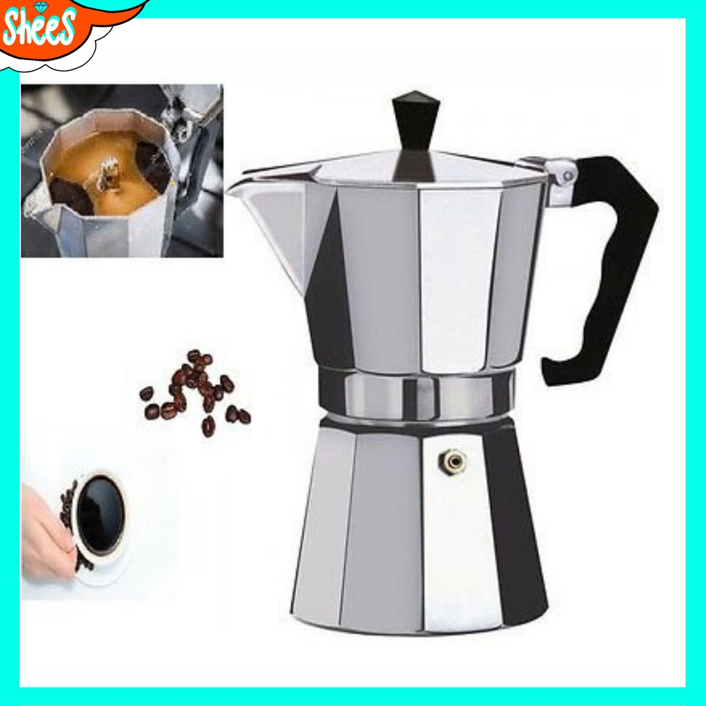(300-ML)`Alat Kopi Coffe Maker Mokapot |Mesin Espresso/Coffee Maker Moka Pot 6 Cup Moca Pot EspressoMoka Pot ini berfungsi untuk membuat kopi espresso dengan cara yang mudah dan cepat. Cukup masukkan air dan bubuk kopi kedalam tempat yang tersedia dan panaskan teko ini, dalam beberapa menit kopi espresso akan siap dihindangkan.FeaturesEasiest Way To Make EspressoMoka Pot merupakan inovasi baru untuk membuat kopi espresso dengan cara yang sangat mudah dan cepat. Kini Anda tidak perlu repot lagi untuk menyeduh kopi espresso dengan menggunakan Moka Pot.Coffee PotSaat cairan kopi tercipta, cairan kopi ini akan langsung tertampung pada sebuah teko. Dengan ini, Anda dapat tinggal menuang kopi ke cangkir dengan cara yang mudah. Tidak perlu repot-repot lagi untuk menyeduh kopi espresso.Stainless SteelMoka Pot terbuat dari stainless steel sehingga tidak akan berkarat meskipun digunakan secara terus menerus.Package ContentsBarang-barang yang Anda dapat dalam kotak produk:1 x Espresso Coffee Maker Moka PotSpesifikasiKapasitas Isi 300ml 6 CupsMaterial Stainless St