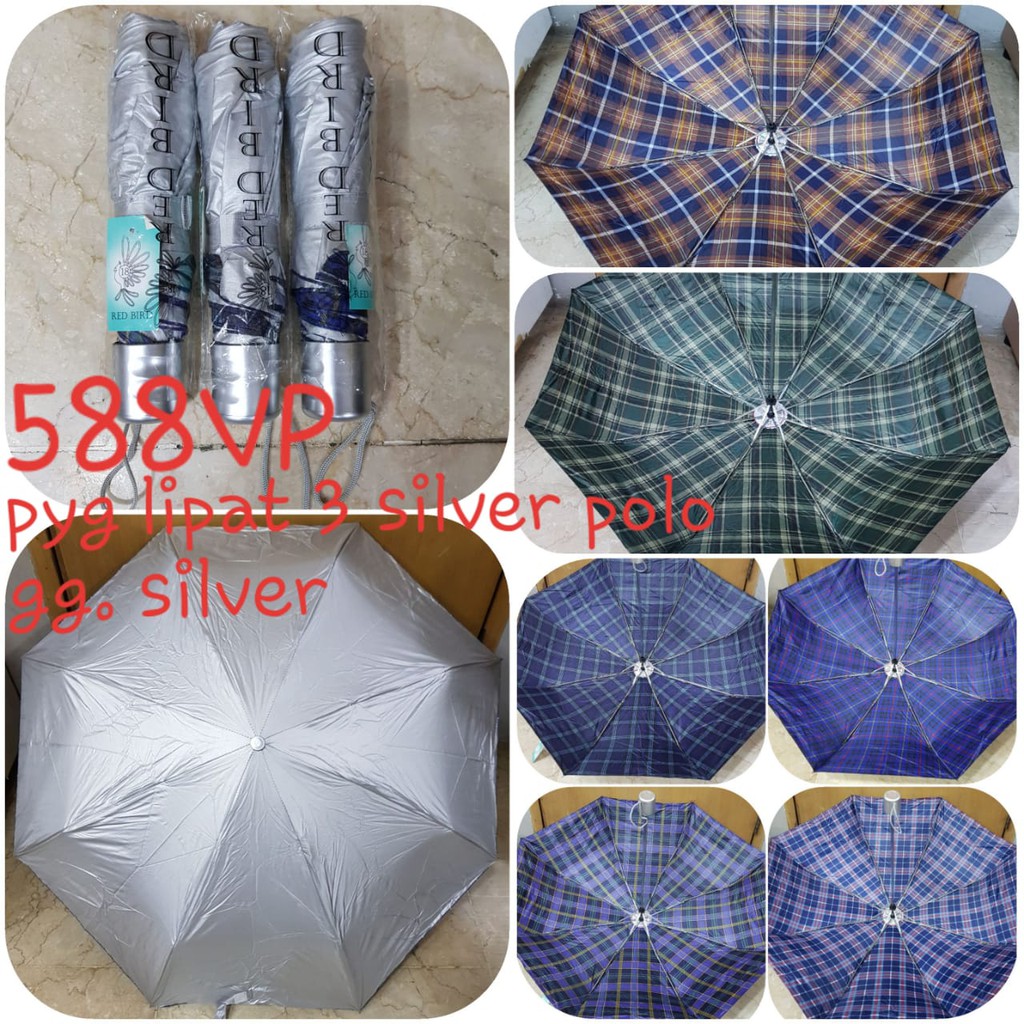 PAYUNG LIPAT 3 SILVER .payung merk redi bird.bahan saten .tidak mudah sobek.warna luar silver, warna dalam payung kotak ko