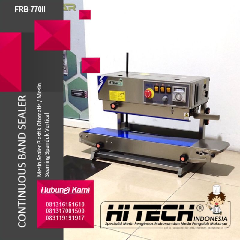 Spesifikasi Mesin :Type : FRB-770II ( Vertical )Voltage : 220 VoltFrequency : 50-60 HzMotor Power : 50 WattSealing Power : 300x2 WattSpeed : 0-12 (0-16)M/MinSealing Width : 8-10 mmDistance From Sealing Center To The Conveyor : 10-40MmTemperature Range : 0-300 °CPrinting Type : EmbossingMax. Conveyor Loading For Single Bag : 3 KgConveyor Size : 84 x 18 cmWeight : 27 KgDimension : 84 x 38 x 27 cm*BE A SMART BUYER*HITECH Indonesia selalu menampilkan foto asli mesin yang kami jual. tidak seperti toko2 lain yang mengambil gambar atau foto dari internet. Foto yg terpajang dietalase kami merupakan produk asli yang kami jual.Catatan Penting Sebelum Melakukan Pembelian :1. Apabila berat pengiriman kami hanya input 1 kg, berarti belum termasuk biaya pengiriman untuk unit mesin yang dibeli dikarenakan apabila kami menginput berat asli makan biaya pengiriman unit mesinnya akan memakan biaya yang sangat mahal.2. Harap hubungi kami terlebih dahulu untuk mengetahui ketersedian stok barang dan untuk mengetahui biaya pengiriman yang MURAH & AMAN untuk mesin yang hendak di beli dikarenakan berat mesin yang kami jual sangat berat, sehingga tidak memungkinkan menggunakan ekspedisi yang bekerja sama dengan SHOPEE. Agar para customer kami tidak terbebani dengan biaya pengiriman yang sangat mahal.3. Untuk Wilayah JABODETABEK kami juga melayani sistem pembayaran ditempat / Cash On Delivery ( Syarat & Ketentuan Berlaku ).4. Untuk Wilayah JAKARTA & TANGERANG FREE biaya pengiriman ( Syarat & Ketentuan Berlaku ).Terima KasihHUBUNGI KAMIHITECH IndonesiaTeam kami senantiasa membantu memberikan solusi terbaik untuk para customer