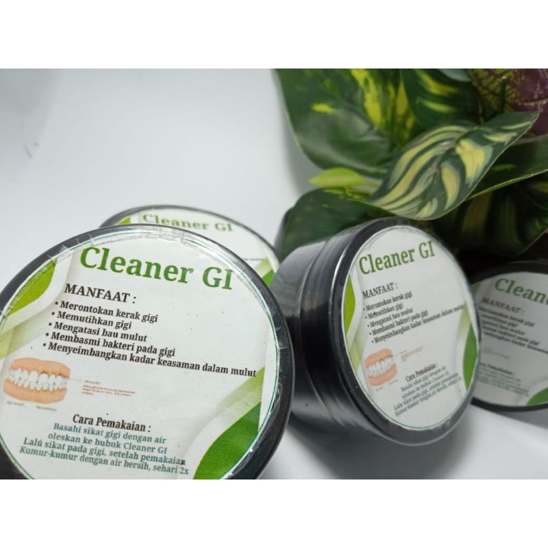 CLEANER GI*CLEANER GI*Ayo di order sekarang juga solusi gigi kuning,gigi berkarat...Yaaaaa CLEANER GI100% Natural tanpa bahan kimia...Berat bersih 30 gram (berat total dengan kemasan 53 gram)Manfaat CLAINER GI* Memutihkan gigi secara alami * Menghilangkan karang gigi* Menghilangkan bau pada mulut.Cara pemakaian 1. Aplikasikan pasta gigi ke atas sikat gigi2. Totol totol pasta gigi kedalam bubuk Teeth Whitening ini3. Pastikan bubuk sudah tertempel merata di pasta gigi4. Sikat gigi selama 2 menit, kumur air sampai bersih5. Dipakai sehari 2x untuk hasil maksimalCLAINER GI adalah pemutih gigi yang efektifmemutihkan gigi tanpa mengikis lapisan pelindung gigiCLAINER GI 100% bahan alamiKapan Lagi bisa Punya Gigi cerah dengan harga terja
