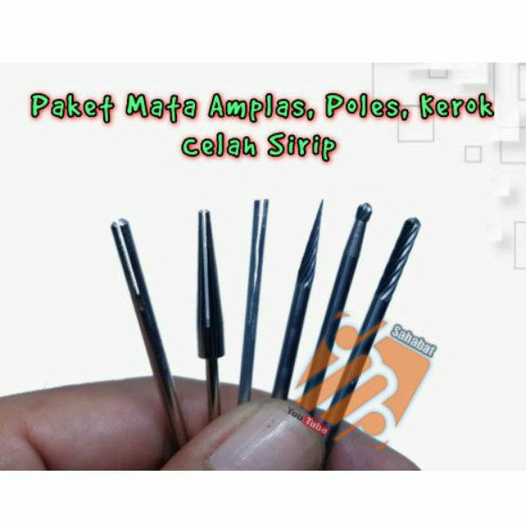 *** harga untuk satu set isi 6pcs seperti pada foto ***mata set antara lain :- paling kiri adalah ruji belah diameter 3mm- nomor 2 dari kiri adalah mata ruji belah kerucut bisa digunakan ke celah berjenis mengerucut sehingga dibutuhkan mata ruji belah berbentuk kerucut- nomor 3 dari kiri adalah mata ruji belah diameter kecil untuk menjangkau celah sirip yg lebih sempit lagi baik pada blok maupun pada kop motor- nomor 4 dari kiri adalah mata kerok runcing untuk membantu mengerok meratakan sisi siku-siku pada celah sirip blok maupun kop dan bisa juga digunakan sebagai mata Grafir ukir pada permukaan logam diral, aluminium, Kuningan, tembaga, dll- nomor 5 dari kiri adalah mata kerok bulat untuk dinding dalam celah sirip diameter ujung berukuran 3mm- nomor 6 dari kiri atau yg paling kanan adalah mata kerok dinding atas-bawah dan sekaligus dinding dalam pada celah sirip berukuran 3mm*** untuk mata kerok sangat tajam, awet digunakan untuk melebarkan celah sirip pada media blok maupun kop yg bertujuan untuk mempermudah proses penjangkauan mata amplas dan poles dan memudahkan pengerjaan selain itu dilebarkan tersebut bertujuan agar lebih mudah menjangkau terutama untuk proses perawatan pada celah sirip nan