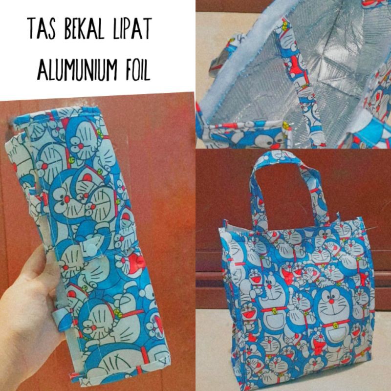 tas bekal lipat doraemonbagian dalam ada aluminium foil bisa dilipat, mudah dibawa dan dimasukkan tas kecilukuran besar 25x14