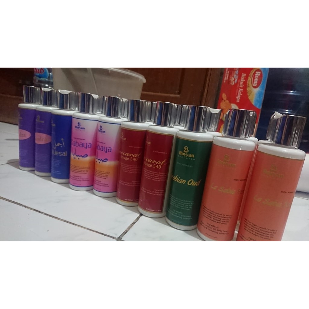 PENGIRIMAN LUAR JAWA JNE DAN SICEPATJNT KHUSUS JAWA DAN BALIEl Royyan Body Wash terbuat dari Virgin Coconut Oil yg mengandung lauric acid yg berfungsi untuk membunuh mikroba baik virus maupun bakteri, dan mengandung Vitamin E yg berfungsi untuk melembutkan dan mencerahkan kulit.Ada 9 Aroma kkSabayaBaccaratKhonjarWhite oudArabian oudSandraWesalTouch meLa Sable
