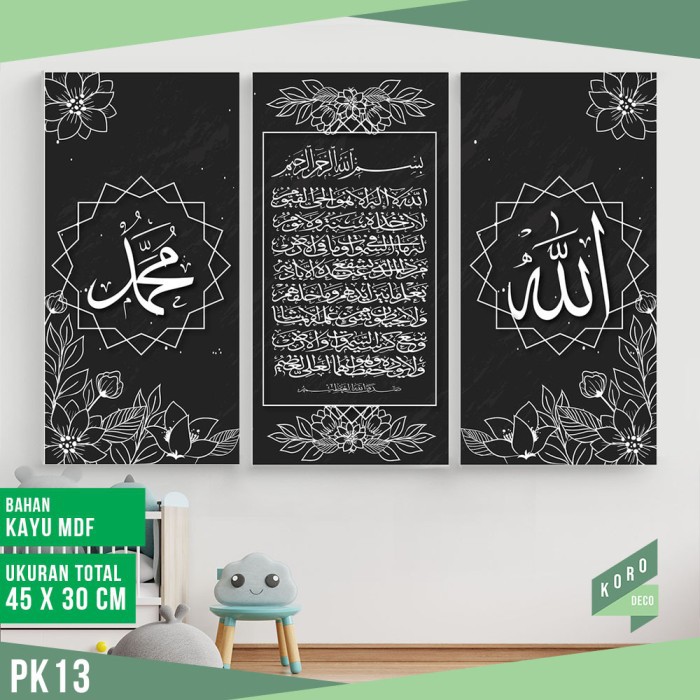 KORO DECORATIONDekorasi Ruangan Paling cantikNyaman itu cantikBersih itu wajibReseller & Dropshiper Mari bergabung, kami akan memberikan Pelayanan terbaikSilahkan Hubungi kami untuk info lebih lanjutDengan Produk :Berkualitas √Gratis Request √Harga Terbaik √SPESIFIKASI :Kode/Motif : PK* Harga : 1 Paket 3 Pcs* Material : Medium-density fibreboard (MDF), Kuat dan permukaan halus,sudah dilapisi pengeras dan anti jamur* Cetak : AC 230 (Lebih tebal & hasil lebih tajam)+Resolusi Tinggi* Sudah Laminasi Doff/Mate/tidak mengkilap (jadi tahan air/debu & mudah dibersihkan)* Ukuran Papan : 15x30cm (Total 45x30cm)* Gantungan : plat besi* Berat : ±250gram per PCS* Variasi Motif : Terdapat ±30 pilihan motif (silahkan cek2 pada Toko Kami)Bisa Custom Ukuran* Ukuran @10x20 Cm* Ukuran @20x40 Cm* Ukuran @30x60 CmKami melayani Request Custom gambar dan ukuran. cek di etalas
