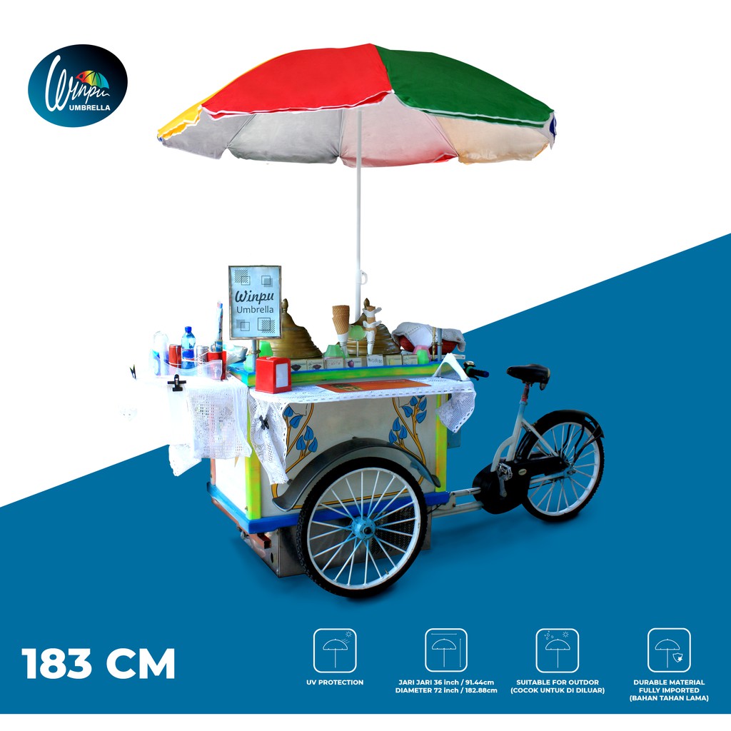 WINPU Payung Pantai Pelangi Anti Uv 2 lapisPayung pantai WINPU merupakan payung yang kualitas-nya sangat teruji di kelas-nya. Payung ini dapat digunakan berbagai keperluan seperti, Jualan, berteduh. Juga, dilengkapi dengan lapisan UV yang sangat tebal, sehingga dapat mengurangi panas terik-nya matahari saat musim panas.spesifikasi:1. Payung Pantai Dengan 2 Lapis Kain2. Lapisan Pertama Kain Polyester Tebal3. Lapisan Kedua Kain Polyester Tebal Dengan Lapisan UV4. Jari-jari 36 inch (91.44 cm ) 5. Diameter 72 inch (182.88cm)6. Merk --> WINPU7. Tinggi Payung --> 38 inch (96 cm)8. Tinggi Pennyambung --> 36inch (91 cm) 9. Bahan Tiang --> besi10. Berat --> 1