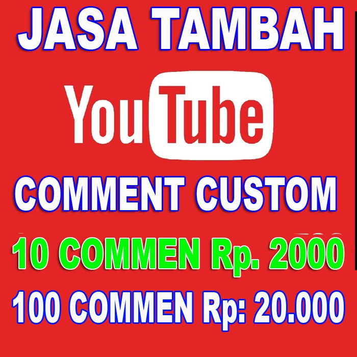 ingin channel youtube naik traffic nya dengan banyak commen positif yang sangat menarik penonton, silahkan di order youtube commen custom sesuai keinginan anda, sangat aman dan bagus untuk channel anda.Harga per 1000 : Rp 400.000harga per 10 commen Rp: 4000Min/Max Order : 10 / 1500Deskripsi : [Masukan Link Video] Layanan Penambahan Komentar Youtube (Costum Bebas), Akun Random Worldwide. Waktu Mulai Instant - 6 Jam.Dipasin ya jangan ditambahin enter kosong nanti bakal e